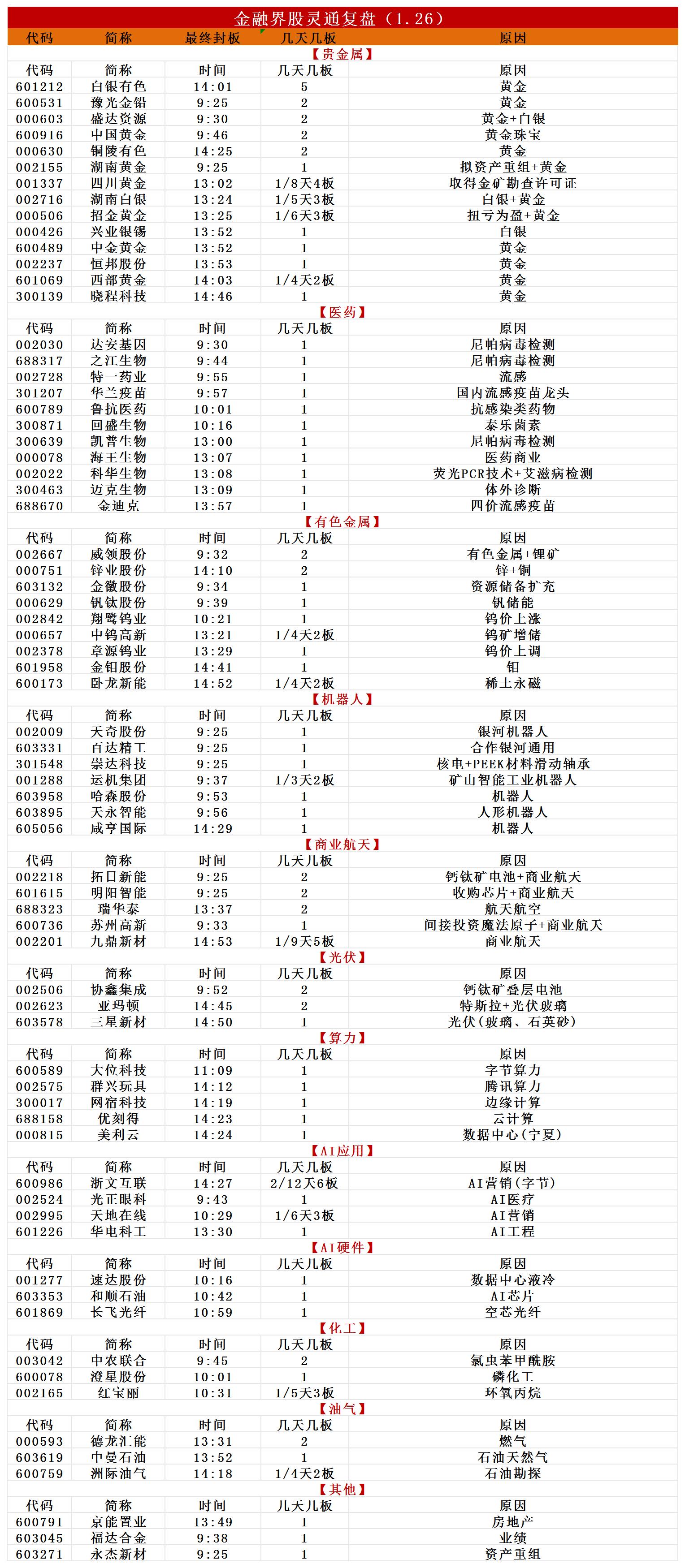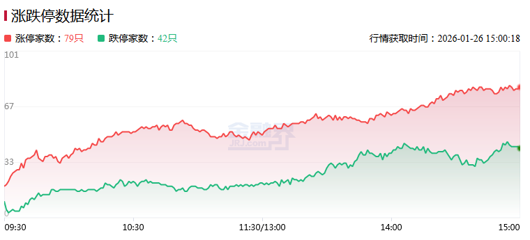 1月26日,市场全天震荡调整,大小指数分化明显,深成指、创业板指高开低走,盘中均跌超1%。沪深两市成交额3.25万亿,较上一个交易日放量1630亿。盘面上,市场热点较为杂乱,全市场超3700只个股下跌,79只股票涨停。从板块来看,有色金属板块涨幅居前,其中贵金属概念领涨,四川黄金8天4板,晓程科技、湖南黄金、盛达资源等多股涨停,紫金矿业创历史新高。油气概念走强,中国海油创历史新高,洲际油气4天3板。太空光伏概念反复活跃,明阳智能、拓日新能、协鑫集成涨停。化工板块震荡拉升,红宝丽、澄星股份涨停。下跌方面,商业航天、半导体设备等板块跌幅居前。其中多只商业航天概念股大跌,中国卫通、中国卫星跌停。截至收盘,沪指跌0.09%,深成指跌0.85%,创业板指跌0.91%。