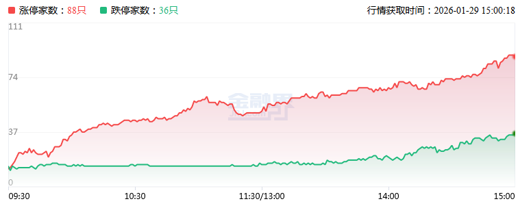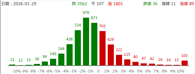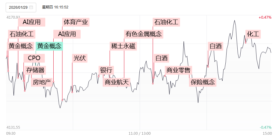 1月29日,三大指数涨跌不一,沪指窄幅震荡,上证50指数涨超1%,创业板指冲高回落,科创50指数跌超3%。沪深两市成交额3.23万亿,较上一个交易日放量2646亿。盘面上,市场热点快速轮动,全市场超3500只个股下跌,88只股涨停。从板块来看,白酒(核心股)板块午后爆发,泸州老窖、五粮液、山西汾酒水井坊、舍得酒业、皇台酒业、酒鬼酒涨停。有色金属(核心股)板块反复活跃,金属铜、贵金属(核心股)领涨,西部黄金7天4板,中国黄金5连板,北方铜业2连板创历史新高。油气股延续强势,洲际油气7天5板,准油股份2连板,中曼石油4天3板。房地产板块震荡反弹,大悦城、三湘印象、我爱我家涨停。下跌方面,芯片产业链下挫,美埃科技、京仪装备跌超9%。截至收盘,沪指涨0.16%,深成指跌0.3%,创业板指跌0.57%。