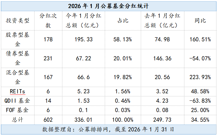 公募排排网数据显示,截至2026年1月31日,全市场公募基金当月累计分红次数达602次,分红总额336.01亿元,同比增长34.55%。