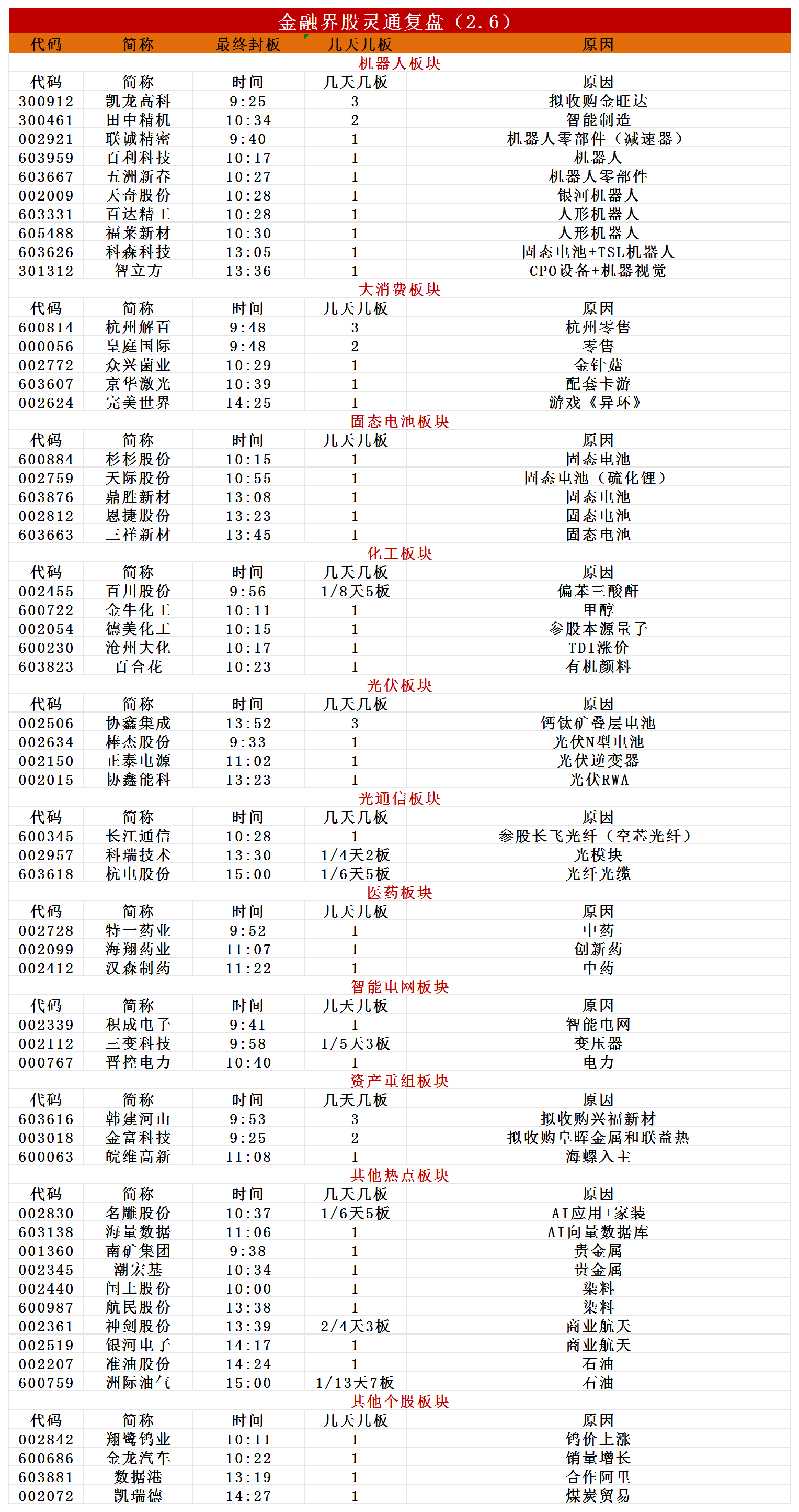 2月6日,市场低开高走后,尾盘再度回落翻绿。截至收盘,沪指跌0.25%,深成指跌0.33%,创业板指跌0.73%。沪深两市成交额2.15万亿,较上一个交易日缩量305亿。盘面上,市场热点快速轮动,全市场超2700只个股上涨,共63只股涨停。从板块来看,化工板块集体走强,沧州大化、金牛化工、百川股份、百合花涨停。固态电池概念震荡走高,科森科技、鼎胜新材涨停。人形机器人概念表现活跃,五洲新春、联诚精密、天奇股份涨停。油气股回暖,准油股份涨停。下跌方面,大消费板块集体下挫,白酒、旅游酒店方向跌幅居前,皇台酒业跌停。AI应用端走弱,浙文互联触及跌停。