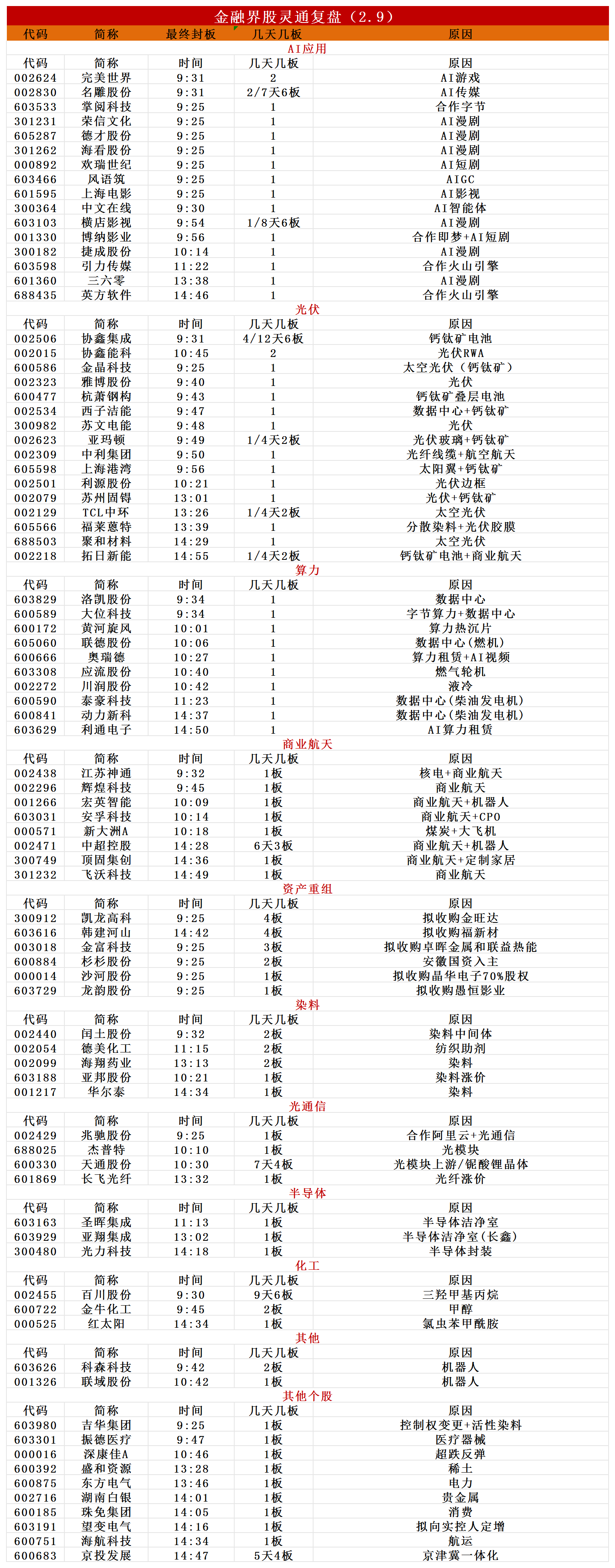 2月9日,市场高开高走,沪指涨超1%,深成指涨超2%。截至收盘,沪指涨1.41%,深成指涨2.17%,创业板指涨2.98%。沪深两市成交额2.25万亿,较上一个交易日放量1038亿。盘面上,市场热点快速轮动,全市场超4600只个股上涨。从板块来看,AI应用端持续拉升,引力传媒、荣信文化、中文在线、海看股份、掌阅科技、欢瑞世纪涨停。化工板块反复活跃,闰土股份2连板,红太阳、华尔泰、海翔药业、亚邦股份涨停。光伏概念表现活跃,协鑫集成4连板,TCL中环4天2板。算力硬件概念集体走强,天孚通信触及20CM涨停创历史新高。商业航天概念走高,中超控股、顶固集创、杭萧钢构涨停。下跌方面,油气股走势较弱,通源石油、潜能恒信震荡下挫。