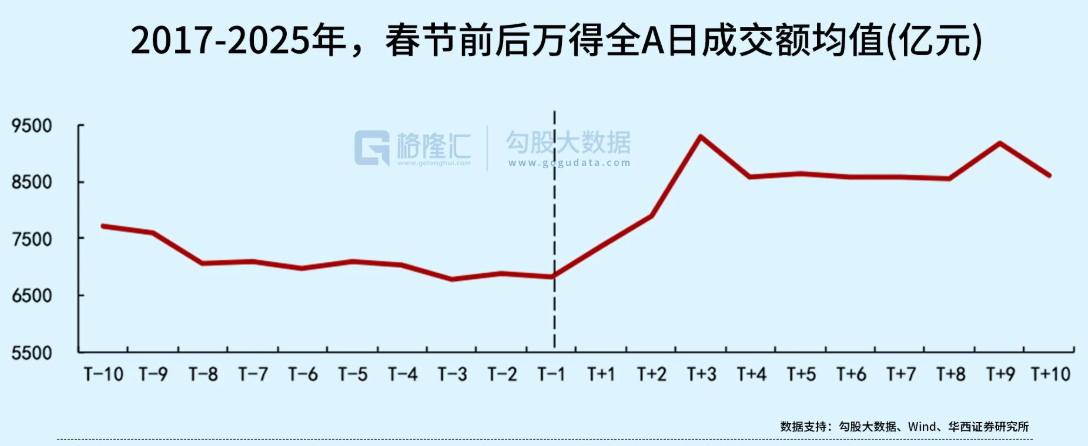 过去九年间,万得全A日均成交额呈现节前萎缩,节后放量的特征。在春节后的10个交易日,全A成交额平均值较春节前10个交易日提升20%。其中,2025年春节后全A成交额较春节前大幅放量40%。