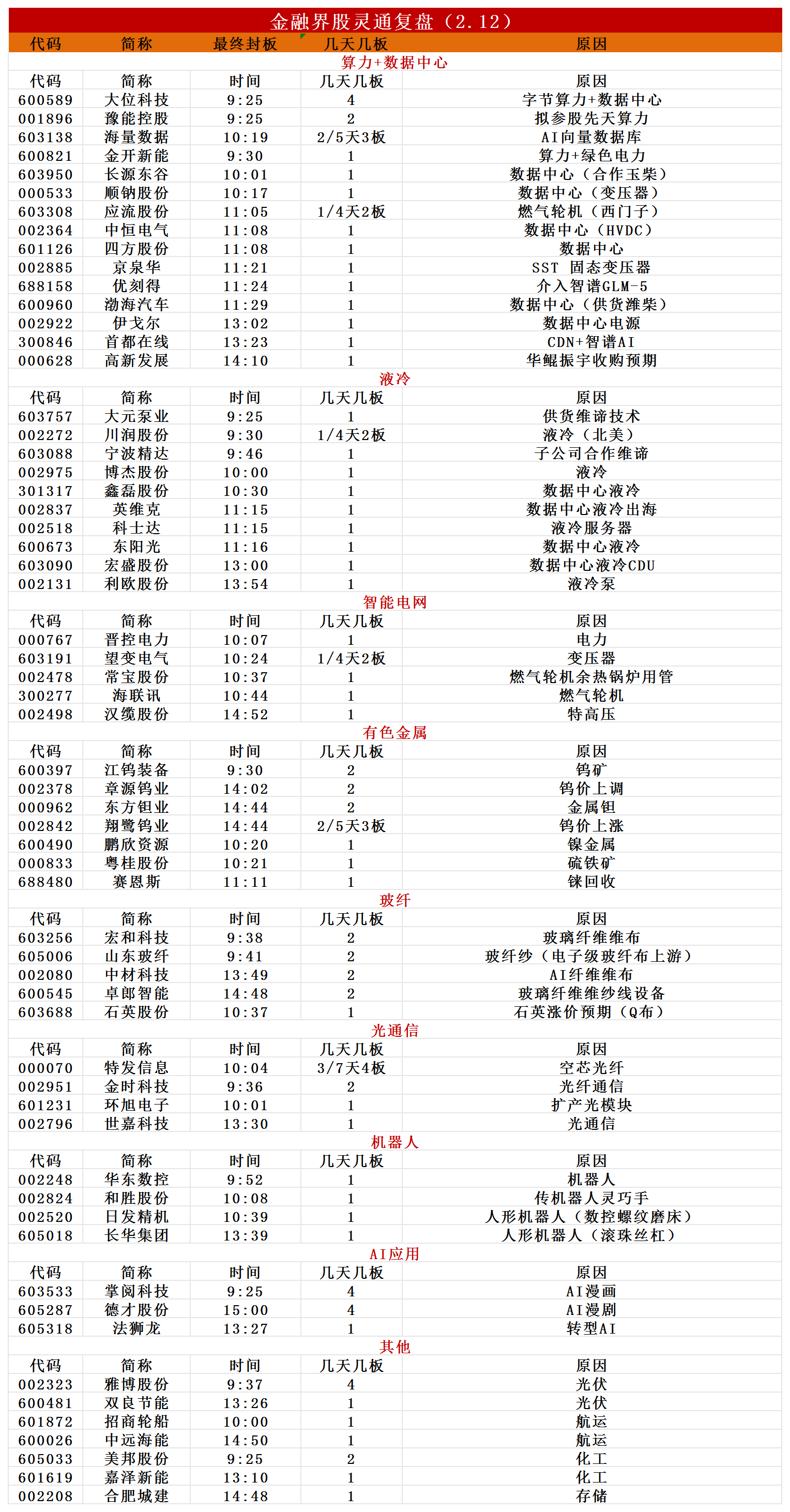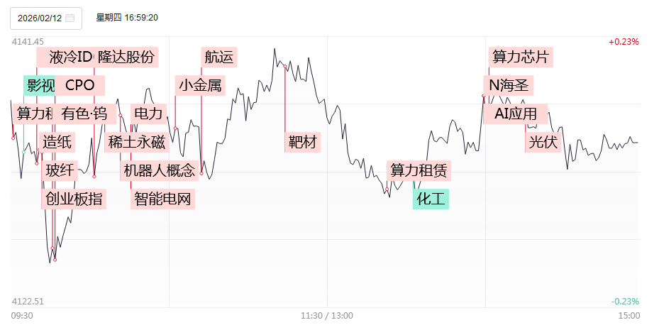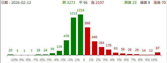 2月12日,三大指数集体收涨,创业板指、科创50指数均涨超1%。截至收盘,沪指涨0.05%,深成指涨0.86%,创业板指涨1.32%。大小指数分化,微盘股指数跌超1%。沪深两市成交额2.14万亿,较上一个交易日放量1575亿。全市场超3200只个股下跌,共70只股涨停。从板块来看,算力产业链集体爆发,算力租赁概念走强,大位科技4连板,首都在线、优刻得20CM涨停。CPO概念快速拉升,天孚通信、罗博特科均续创历史新高。算力芯片概念午后走高,芯原股份大涨超10%。液冷服务器概念表现活跃,川润股份4天2板,大元泵业涨停。电网设备概念集体走强,思源电气、四方股份均创新高,望变电气、顺钠股份涨停。下跌方面,大消费板块集体走弱,影视院线、旅游酒店、零售、食品饮料等板块跌幅居前,横店影视、海欣食品跌停。