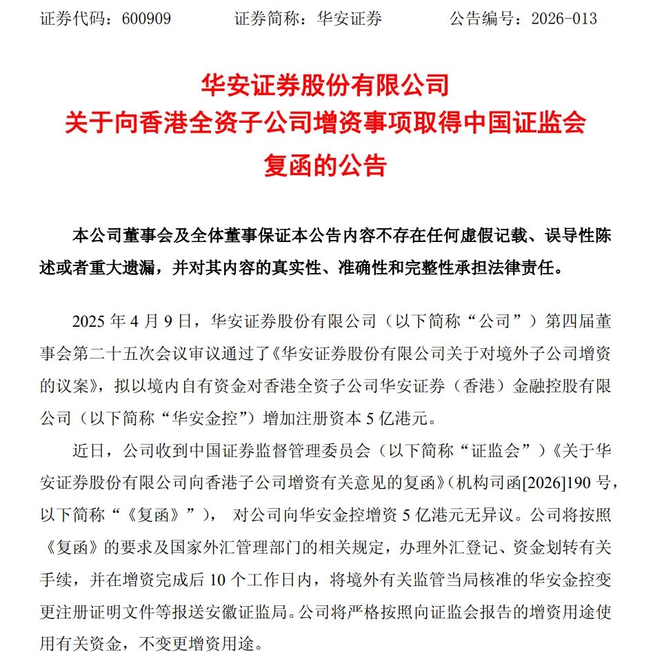 2月10日,华安证券发布公告称,公司近日收到中国证监会《关于华安证券股份有限公司向香港子公司增资有关意见的复函》(下称《复函》),对其向华安金控增资5亿港元无异议。