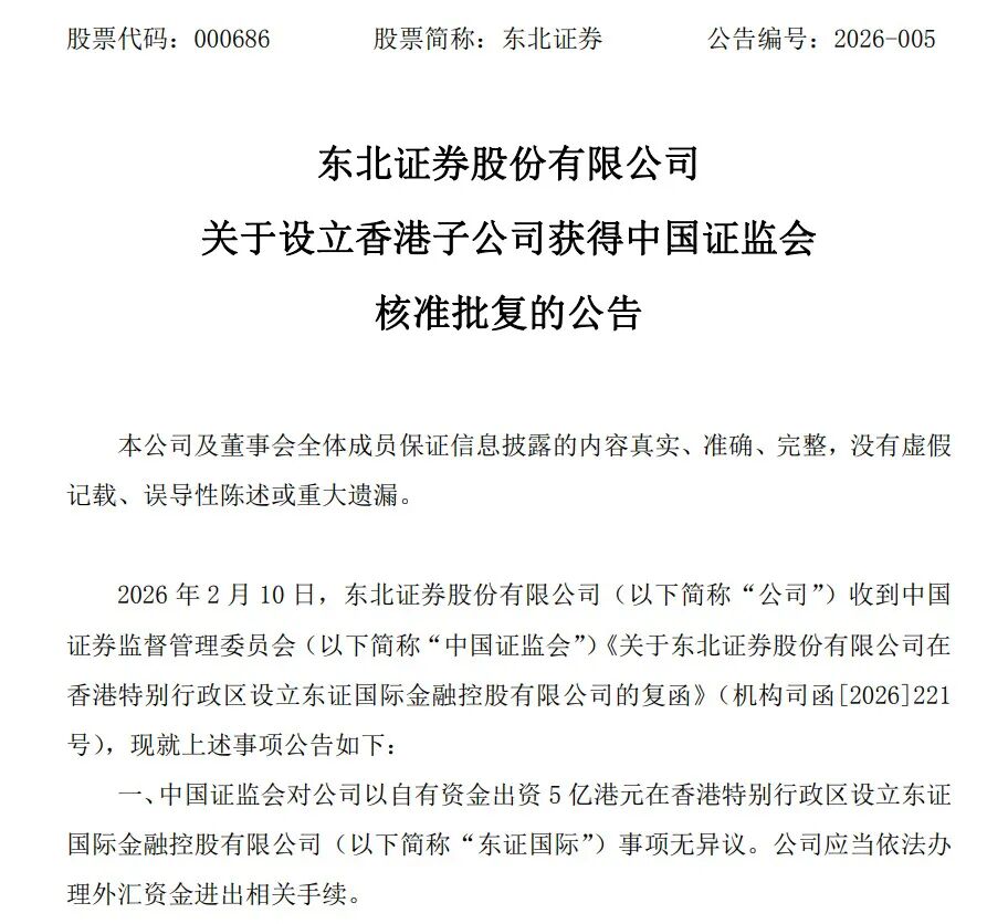 无独有偶。东北证券同日官宣,中国证监会对公司以自有资金出资5亿港元在香港特别行政区设立东证国际事项无异议,公司应当依法办理外汇资金进出相关手续。