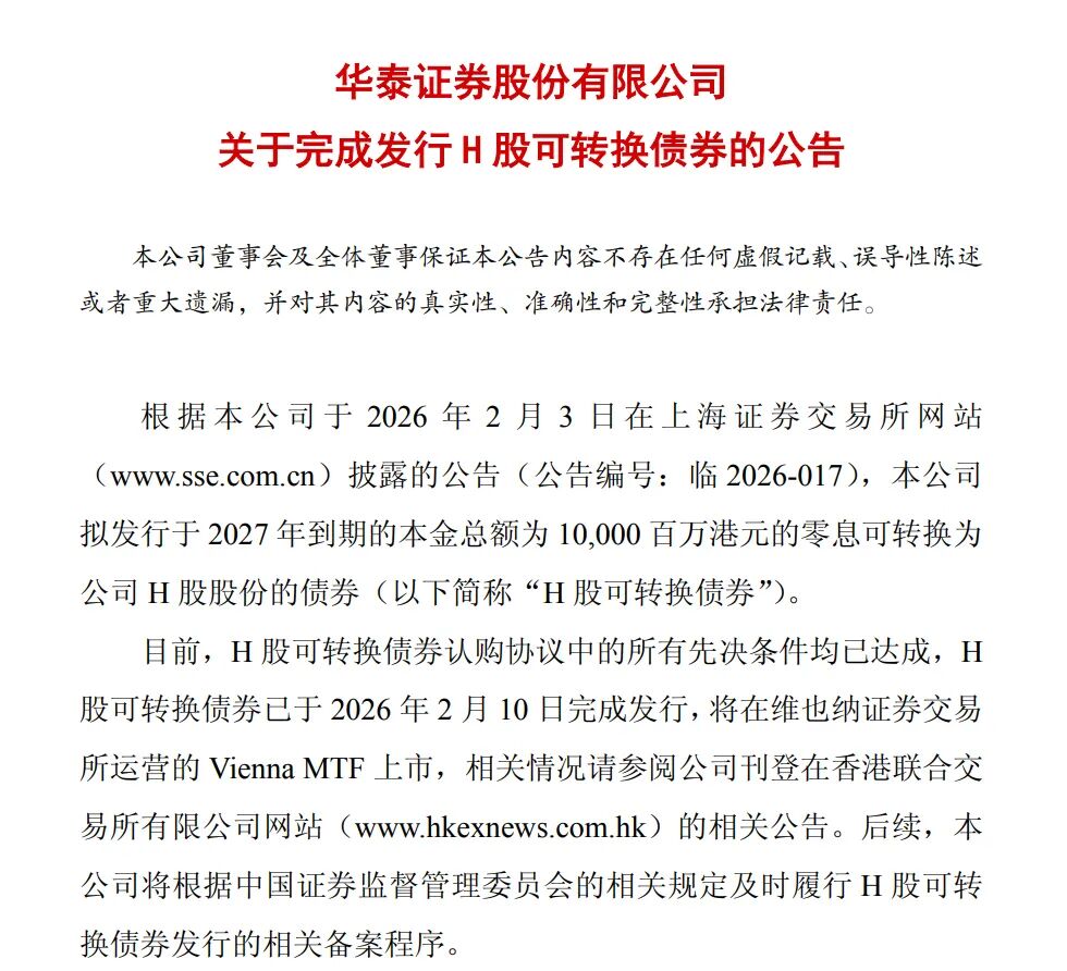 此外,华泰证券完成了境外业务的资金补充。同日,华泰证券公告称,此前拟发行的2027年到期、本金总额100亿港元H股零息可转换债券,其认购协议项下所有先决条件均已达成,并于当日完成发行,该债券将在维也纳证券交易所运营的Vienna MTF挂牌上市。