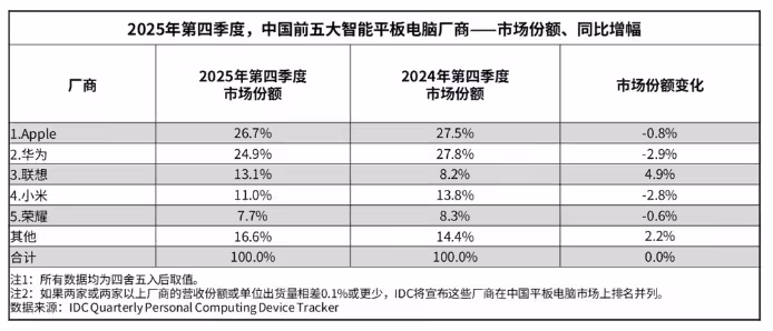 IDC报告:2025年中国平板电脑市场出货量3376万台同比增长13.1%,华为、苹果、小米前三