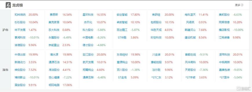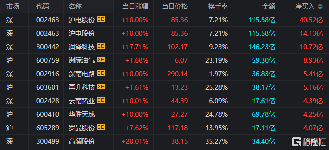 龙虎榜单日净买入额前三为沪电股份、华胜天成、高澜股份,分别为14.13亿元、4.25亿元、3.76亿元。