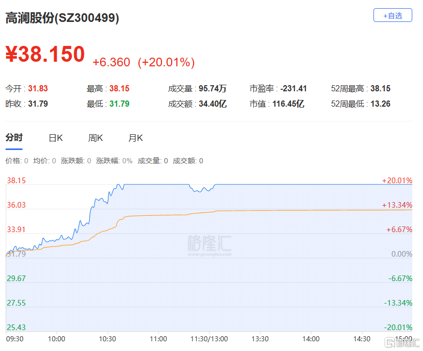 高澜股份:今日20cm涨停,偏离值20.00%,换手率35.27%,成交额34.40亿。龙虎榜数据显示,深股通专用席位净买入1.60亿元,机构净买入1.14亿元。