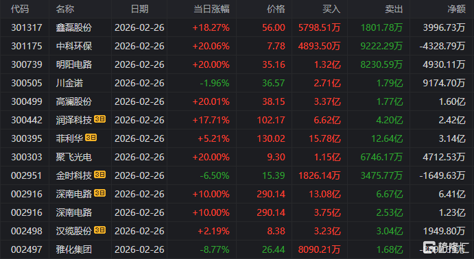 龙虎榜单日净卖出额前三为电科蓝天、明阳电路、清水源,分别为1.94亿元、1.61亿元、1.41亿元。