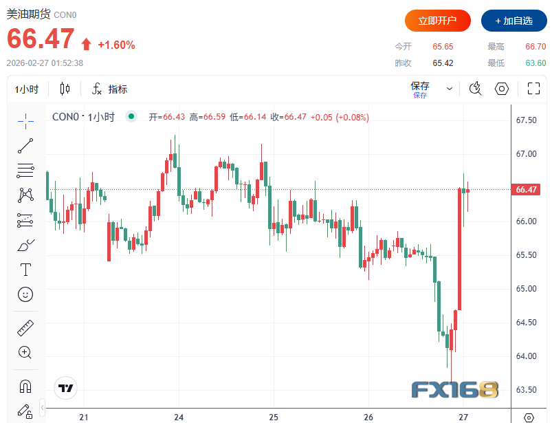 原油市场受美伊核谈动态牵动。WTI原油一度下跌2.8%,随后反弹至66美元上方,走出深V反转。