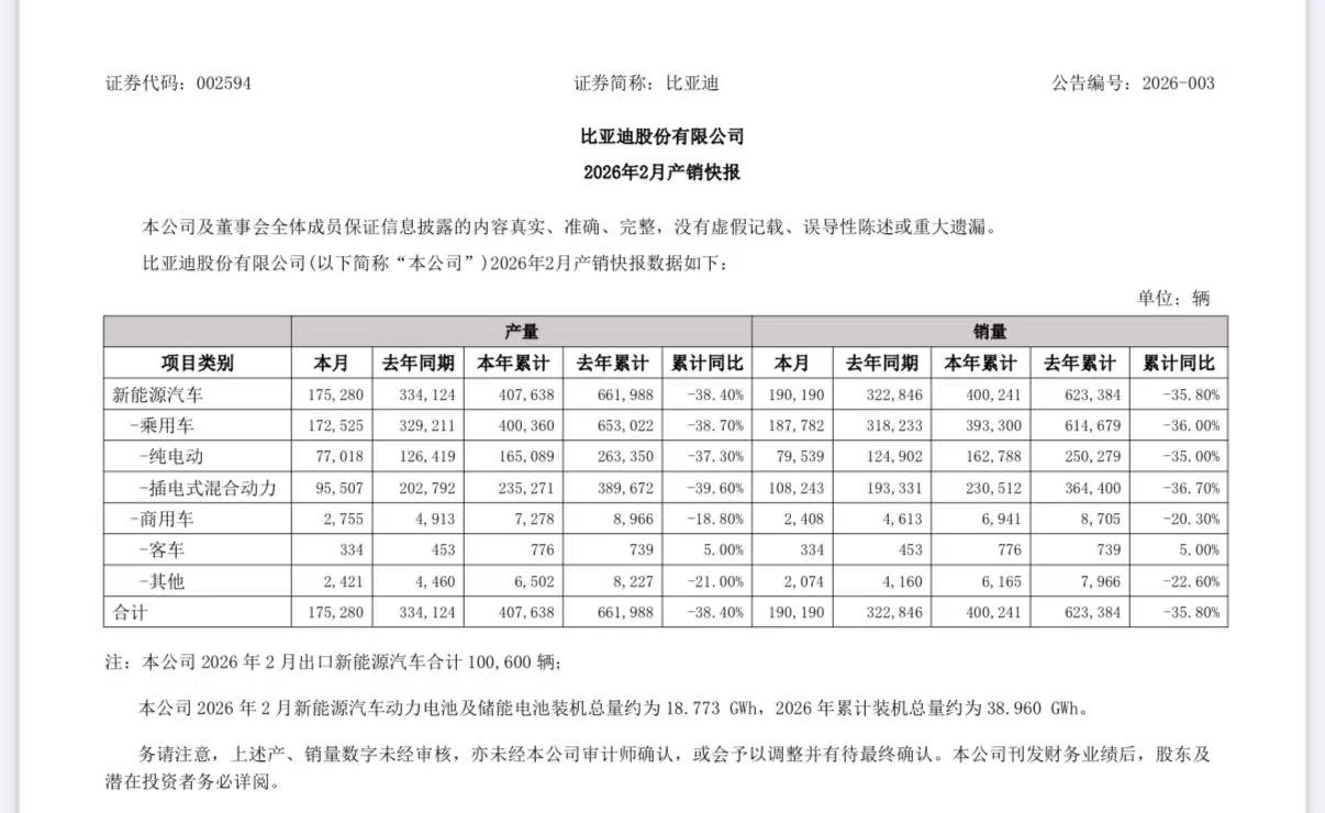 3月1日,比亚迪公告称2026年2月实现新能源汽车(核心股)销量190,190辆;2月出口新能源汽车达100,600辆。2月新能源汽车动力电池及储能(核心股)电池装机总量约为18.773GWh。