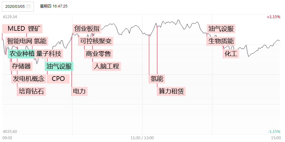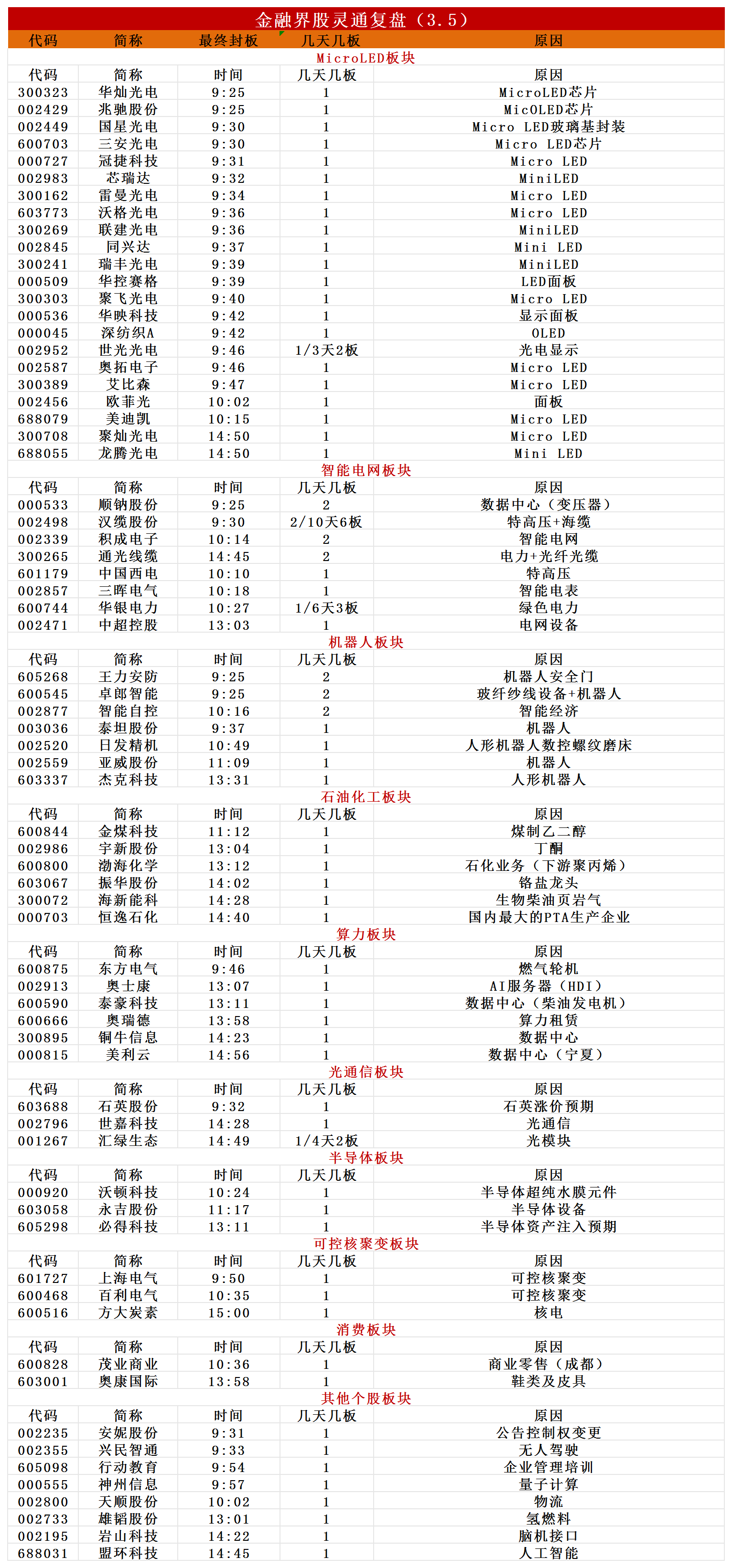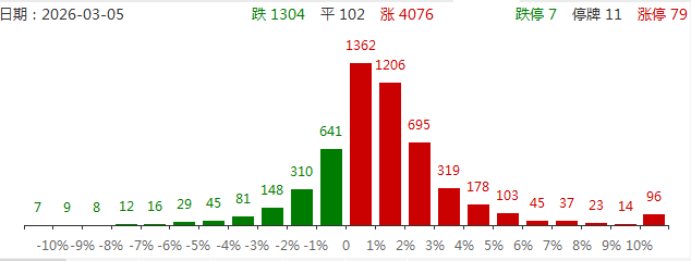 3月5日,市场全天冲高回落,创业板指此前一度涨超3%。沪深两市成交额2.39万亿,较上一个交易日放量243亿。盘面上,市场热点快速轮动,全市场近4100只个股上涨,共78股涨停。从板块来看,MicroLED概念集体爆发,龙腾光电、华灿光电、聚灿光电、聚飞光电20CM涨停,国星光电、三安光电等多股涨停。电网设备概念延续强势,中国西电涨停创历史新高,汉缆股份、积成电子、顺钠股份2连板。算力(核心股)租赁概念快速拉升,美利云、铜牛信息双双涨停。CPO概念(核心股)持续走强,凯格精机涨超14%续创历史新高。量子科技(核心股)概念表现活跃,神州信息涨停。下跌方面,种业板块大面积调整,秋乐种业、康农种业、神农种业跌超10%。油气股午后冲高回落,水发燃气跌停。截至收盘,沪指涨0.64%,深成指涨1.23%,创业板指涨1.66%。 今日全市场(不含ST股、退市股)共69股涨停,连板股总数7只,30股封板未遂,封板率为70%。焦点股方面,电力、电网板块强者恒强,汉缆股份10天6板,华银电力6天3板,通光线缆20CM2连板。