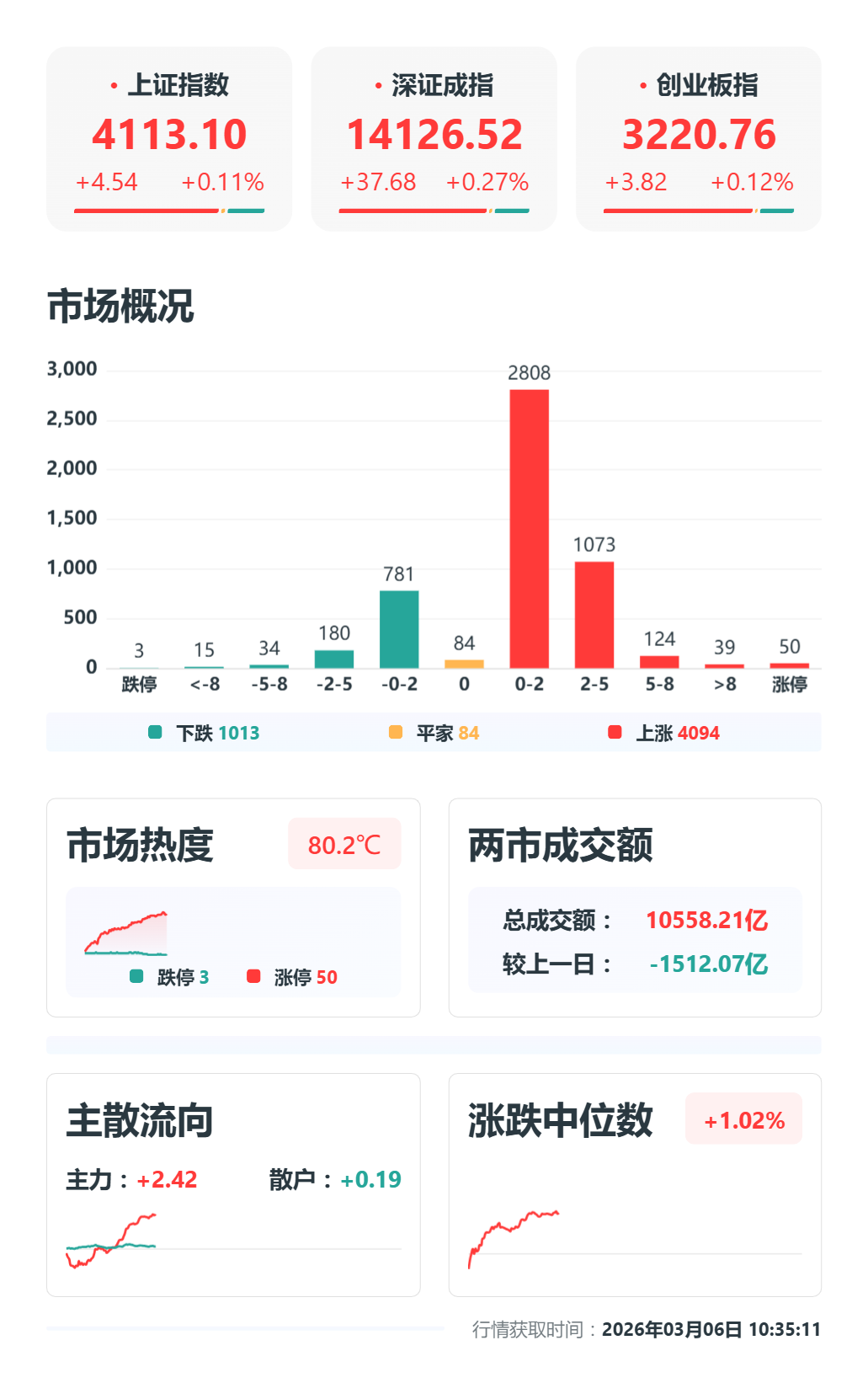 A股三大指数低开高走全线翻红,截至发稿,沪指涨0.12%,报4113.10点,深成指涨0.27%,报14126.52点,创业板指涨0.12%,报3220.76点,科创50指数涨0.41%,报1411.08点。沪深两市合计成交额10558亿元,较前一交易日成交缩量约1512.07亿元,超4000只个股上涨。农业、化工(核心股)、脑机接口、电网等方向涨幅居前。