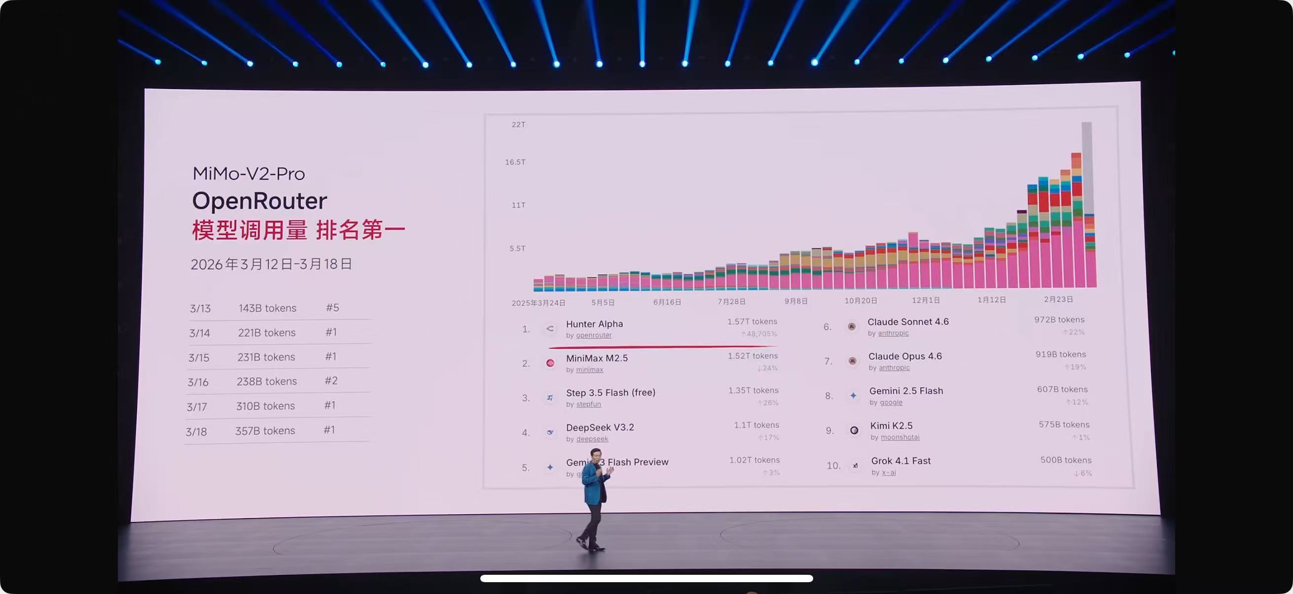 3月19日,在今晚的新一代小米SU7春季新品发布会上,小米创办人、董事长兼CEO雷军称:小米大模型Xiaomi MiMo-V2-Pro在知名大模型API聚合平台OpenRouter上发布后,近一周(2026年3月12日-3月18日)模型调用量排名第一!在大模型智能指数全球总榜第八、按品牌排名全球第五!