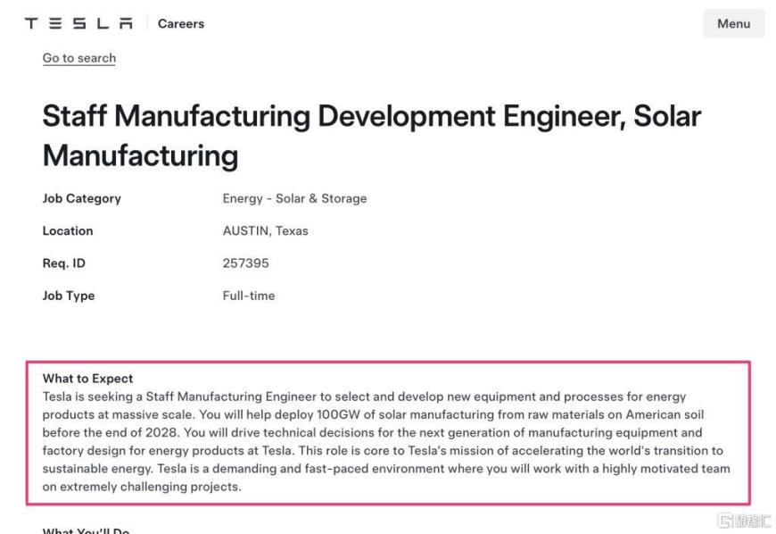 为实现该目标,据传马斯克团队在2月初走访了多家中国光伏企业,特斯拉官网亦发布了太阳能资深工程师招聘启事。