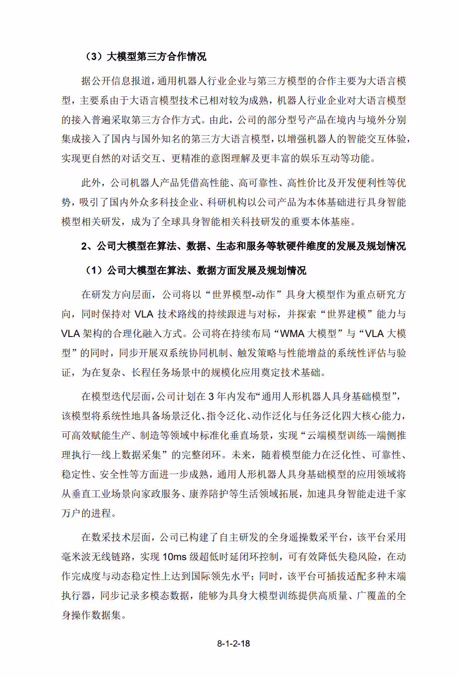 3 月 20 日,上交所受理宇树科技科创板 IPO 申请,公司拟融资金额 42.02 亿元。根据发行人及中介机构关于第二轮预先审阅问询函的回复,在模型迭代层面,宇树科技计划在 3 年内发布“通用人形机器人具身基础模型”,该模型将系统性地具备场景泛化、指令泛化、动作泛化与任务泛化四大核心能力,可高效赋能生产、制造等领域中标准化垂直场景,实现“云端模型训练-端侧推理执行-线上数据采集”的完整闭环。