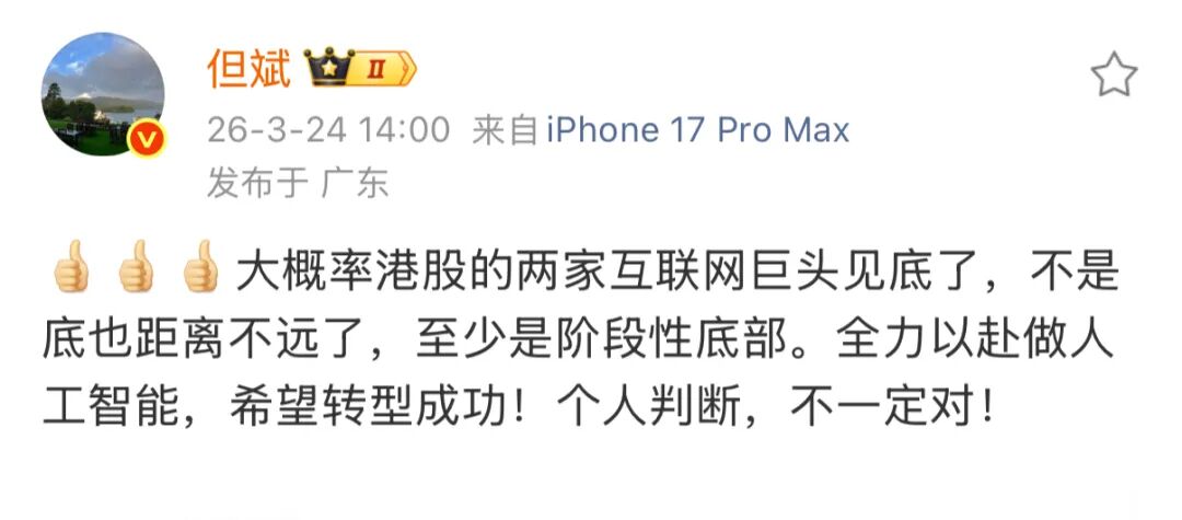非常凑巧的是,3月24日,私募大佬但斌在社交媒体上发文称,在香港上市的两家互联网巨头见底了。