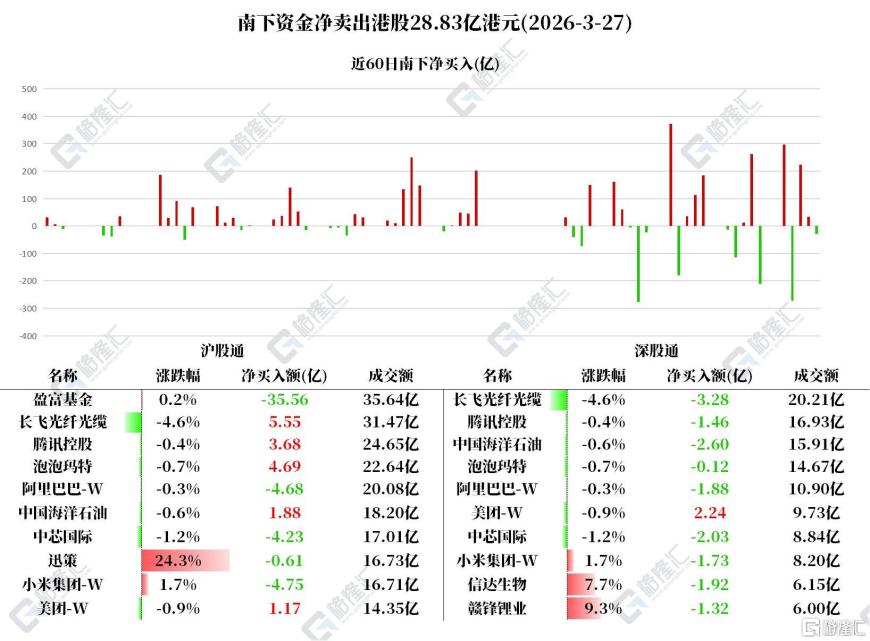 南下资金今日净卖出港股28.83亿港元。