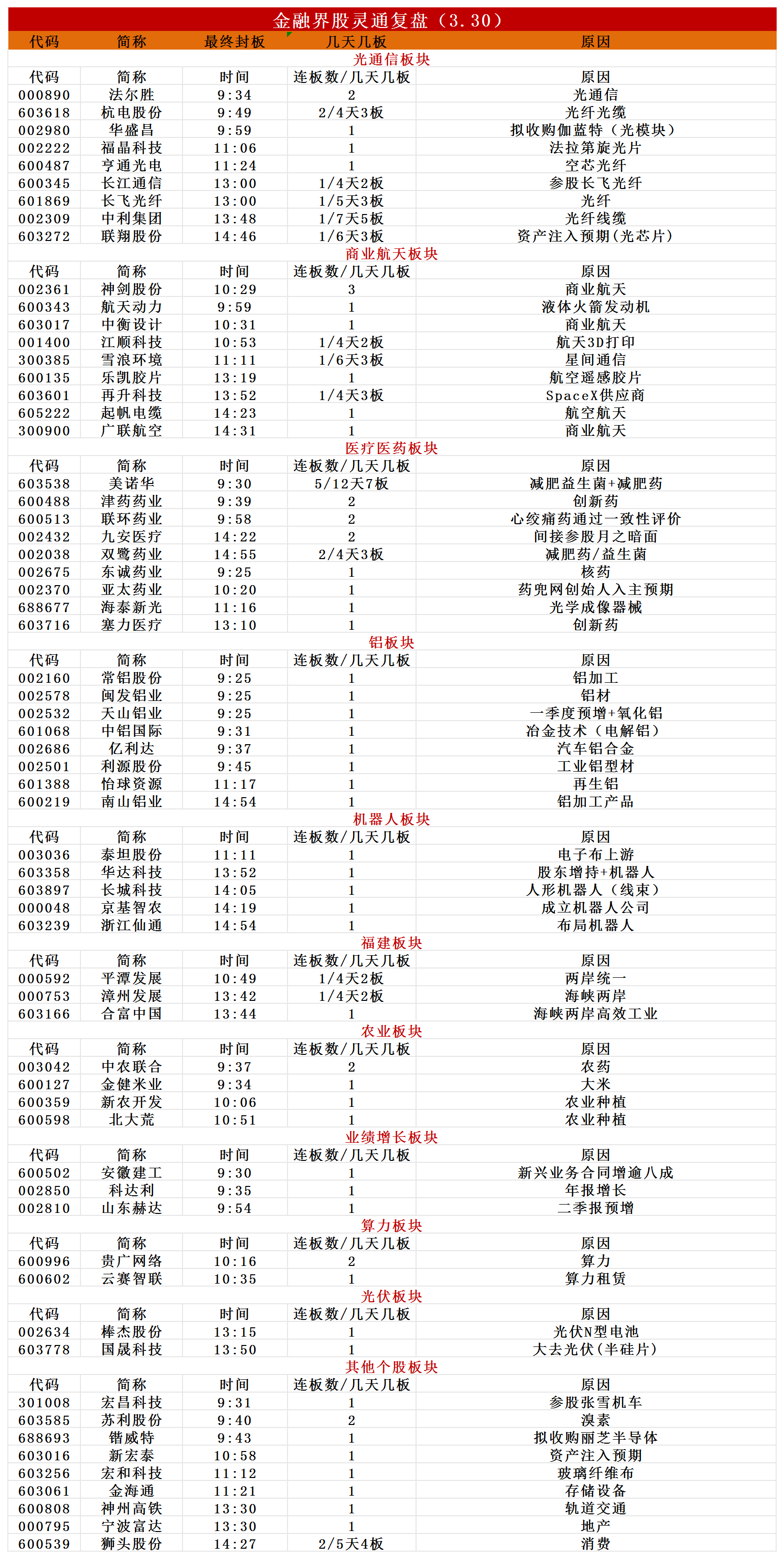 从板块来看,医药板块反复活跃,美诺华走出5连板,津药药业、联环药业双双2连板。商业航天概念探底回升,神剑股份3连板,再升科技4天3板,江顺科技4天2板,广联航空20CM涨停,航天动力、中衡设计涨停。有色·铝方向全天走强,闽发铝业、常铝股份、天山铝业、中铝国际涨停。光纤概念盘中持续走高,中利集团7天5板,杭电股份4天3板,法尔胜2连板,长飞光纤走出5天3板,续创历史新高。