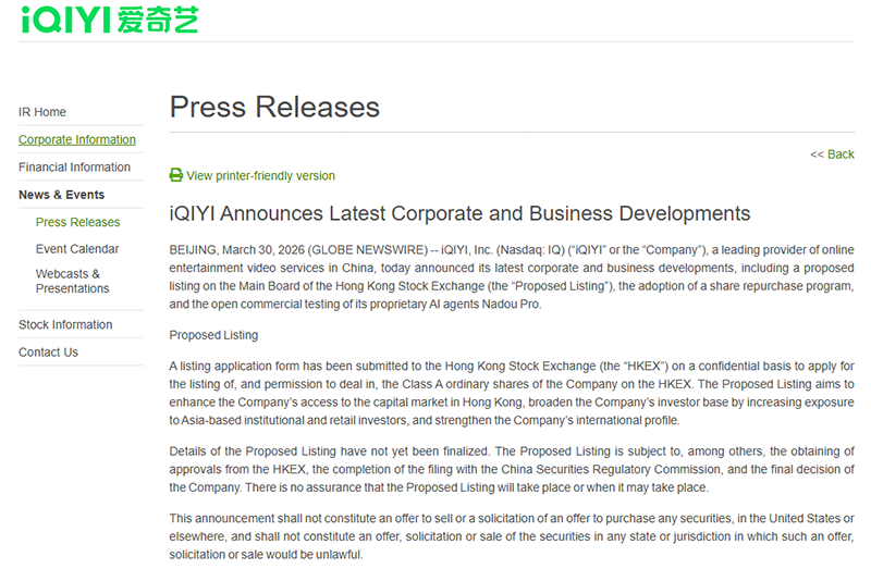 爱奇艺宣布已递表港交所,并披露1亿美元股份回购计划