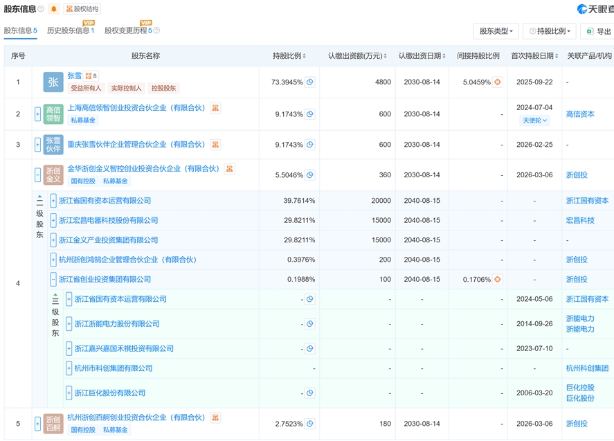 这笔投资由金华浙创、杭州浙创出资。投资人中,金华浙创由宏昌科技出资29.82%。宏昌科技主营包括家电零部件、汽车零部件、模具及设备自动化等业务。此外,浙能电力、巨化股份同样通过浙创投间接持有少量股份。