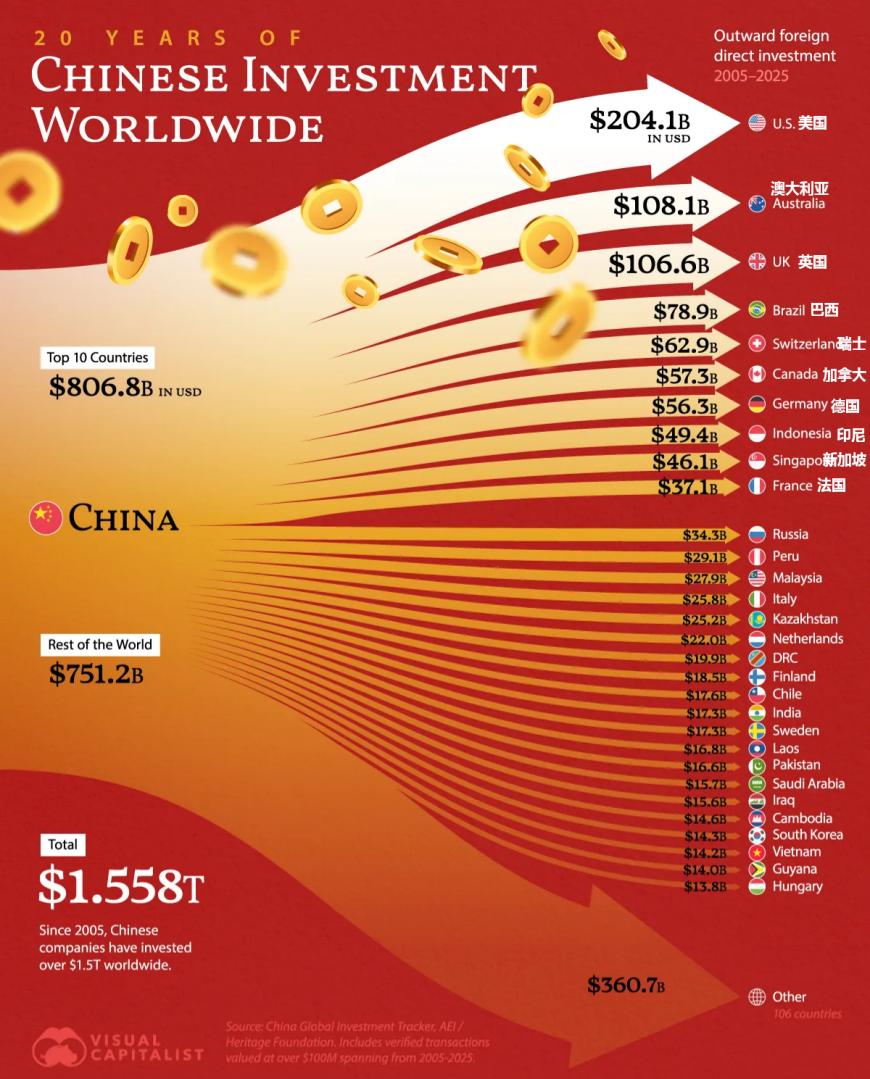 4月1日,根据美国企业研究所和美国传统基金会联合发布的《中国全球投资追踪报告》(CGIT),2005年至2025年间,中国企业海外投资达到1.558万亿美元,其中超过一半的投资(8068亿美元)流向了十个国家。