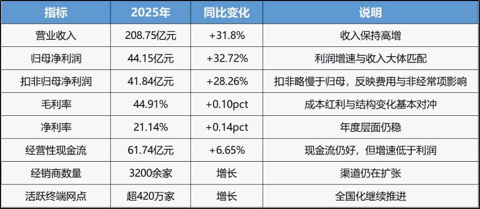 答案藏在这份年报的细节里。2025年,东鹏饮料实现营收208.75亿元,同比增长31.8%,归母净利润44.15亿元,同比增长32.72%,表面上依旧是高景气的成长态势,甚至在能量饮料市场拿下销量、销售额双第一的宝座。但单看第四季度,画风突变:营收40.31亿元同比增长22.88%,归母净利却仅6.54亿元,同比增速骤降至5.66%,而且净利率直接下滑2.64个百分点至16.23%。