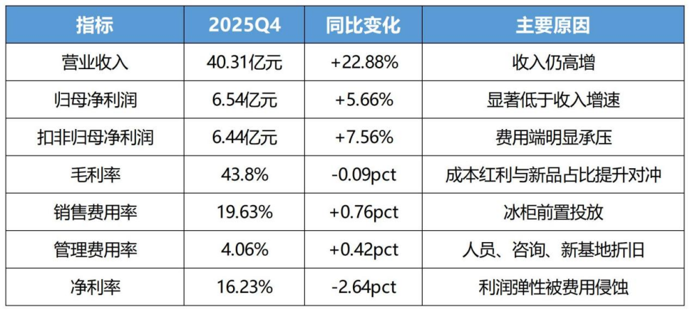 先看一组关键数据:2025年第四季度,东鹏饮料营收40.31亿元,同比增长22.88%;归母净利润6.54亿元,同比仅增长5.66%;扣非归母净利润6.44亿元,同比增长7.56%;净利率16.23%,同比下滑2.64%。营收增速与利润增速的巨大差距,背后是多重因素的叠加影响: