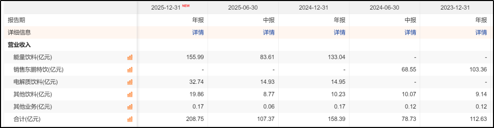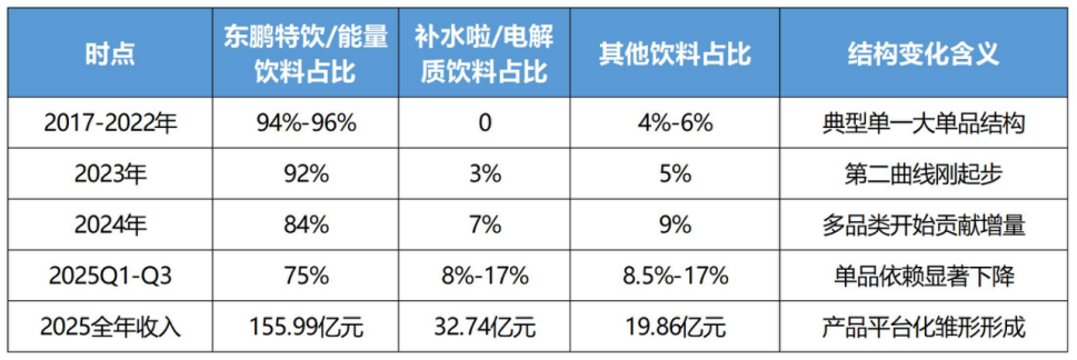 东鹏饮料的核心业务,始终围绕“功能性饮料”展开,不过这几年,公司业务结构已经发生了很大变化,从高度依赖东鹏特饮的“大单品”,逐步向“双引擎+多品类”的平台型企业演进,这一转变也是利润承压的根源。