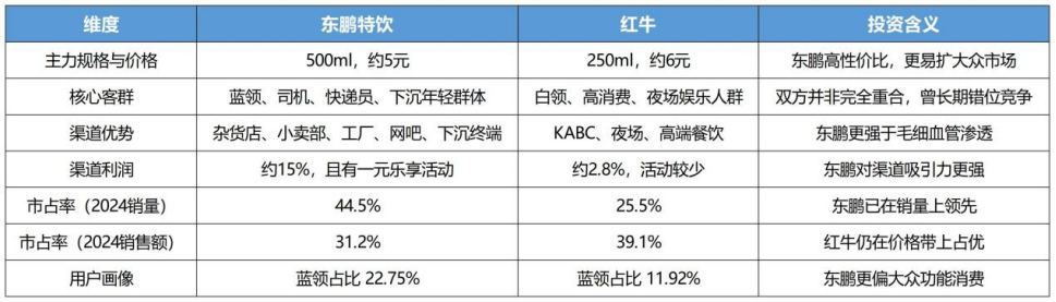 第一,性价比壁垒。不是简单的“便宜”,是重构了产品的定位。东鹏特饮以500ml大瓶装、5元左右的价格,精准切入大众提神需求市场,将单位价格控制在红牛的一半以下,不仅从红牛手中抢占了部分存量用户,更将蓝领、大车司机等原本不喝能量饮料的群体拉进市场,本质上是“扩容了大众化能量饮料市场”,这种性价比优势,短期内带来了巨大的增长动力;