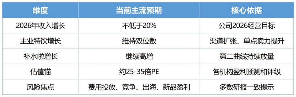 短期叙事(1年内):核心是“费用前置能否兑现利润修复”。最开始提到了2025年Q4,东鹏将大量渠道费用提前投放的问题,那么市场短期最关心的,就是这些前置费用能否在2026年Q1-Q2实现回收,如果2026年Q1销售费用率下降,净利率明显修复,同时营收仍能维持20%以上的增长,那么东鹏的股价将迎来短期弹性;反之,如果费用投放未能转化为实际销量和利润,那么市场对其的信心将进一步下滑,估值可能继续被压缩;