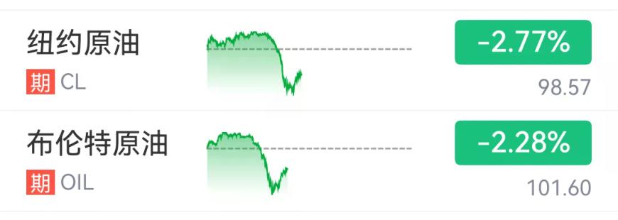 期货日报记者注意到,纽约原油、布伦特原油价格一度双双跌破100美元/桶。截至发稿,纽约原油价格下跌2.77%,报98.57元/桶;布伦特原油价格下跌2.28%,报101.6美元/桶。