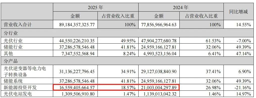 光伏逆变器是光伏发电系统主要部件之一,连接光伏方阵和电网,是确保光伏电站长期可靠运行和提升项目投资回报的关键。2025年,该业务营业收入为311.36亿元,同比去年只增长了20亿元,增速不到7%。该项目占营收的比重也有所降低。