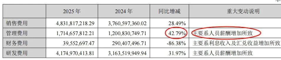 具体来看,阳光电源全年营收增长14.55%,但销售费用48.32亿元,同比增长28.49%,公司表示主要是规模扩张导致人员投入加大所致;管理费用17.15亿元,同比激增42.79%,管理人员薪酬增速远超营收增速。为了保持竞争力,公司研发费用增长31.97%至41.75亿元,研发投入还算合理。