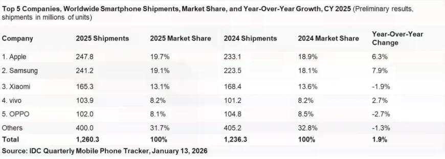 Canalys(现已并入Omdia)数据曾显示,2023年二季度,依托非洲市场回暖与海外多区域扩张加持,传音一度反超vivo、荣耀等品牌,跻身全球智能手机厂商第五位。IDC报告亦显示,2023年传音全年出货量同比大涨30.8%,稳居全球第五,当年第四季度更是攀升至全球第四。2024年,公司势头再进一步,超越OPPO,正式闯入全球四强阵营。然而进入2025年,伴随整体出货量大幅下滑,传音最终跌出全球智能手机前五行列,沦为“others”。