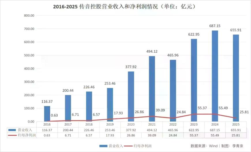 3月底,传音控股发布2025年年度报告。财报显示,公司全年实现营业收入655.91亿元,同比下降4.5%;归属于上市公司股东的净利润为25.81亿元,同比大幅下滑53.49%,盈利能力遭遇“腰斩”;扣非后归属母公司股东的净利润更是下降56.58%至19.72亿元,创下近年来最大跌幅。