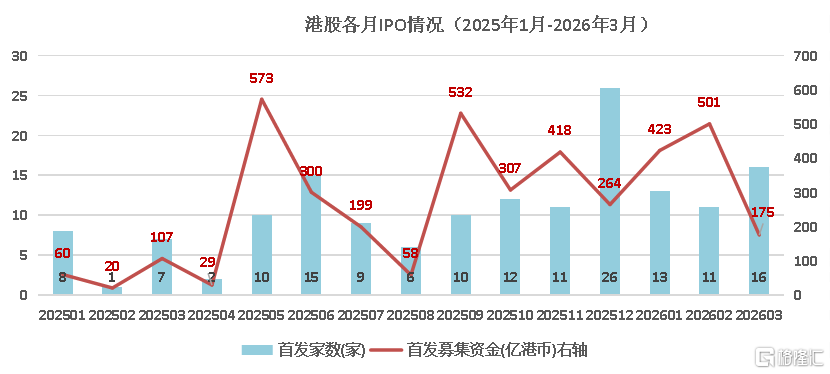 从各月的表现来看,今年1-3月IPO首发募资金额分别为423亿港元、501亿港元、175亿港元,上市新股数量分别为13家、11家、16家,均远高于去年同期。