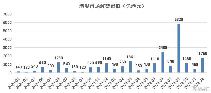 根据海通国际的数据,从时间分布来看,2026年上半年港股解禁规模预计超过4500亿港元;2026年9月预计将迎来约5816亿港元的解禁高峰窗口,主要来源为紫金黄金国际解禁市值约4955亿港元。