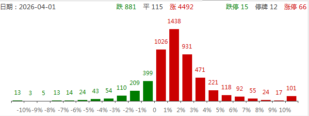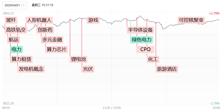 4月1日,市场高开震荡,三大指数均涨超1%,科创50指数涨超3%。截至收盘,沪指涨1.46%,深成指涨1.7%,创业板指涨1.96%。沪深两市成交额2.01万亿,较上一个交易日放量199亿。盘面上,市场热点快速轮动,全市场近4500只个股上涨。从板块来看,医药板块强者恒强,创新药继续领涨,医疗器械、中药等细分方向也全面开花,凯莱英2连板,广生堂、爱迪药业、睿智医药20cm涨停,润都股份、昂利康、海王生物涨停。算力硬件迎来反弹,铭普光磁6天3板,智立方20CM涨停,续创历史新高,瑞斯康达、永鼎股份涨停。下跌方面,电力板块走弱,广西能源、惠天热电跌停。高铁轨交集体下挫,神州高铁炸板回落,通业科技、交大铁发大跌。