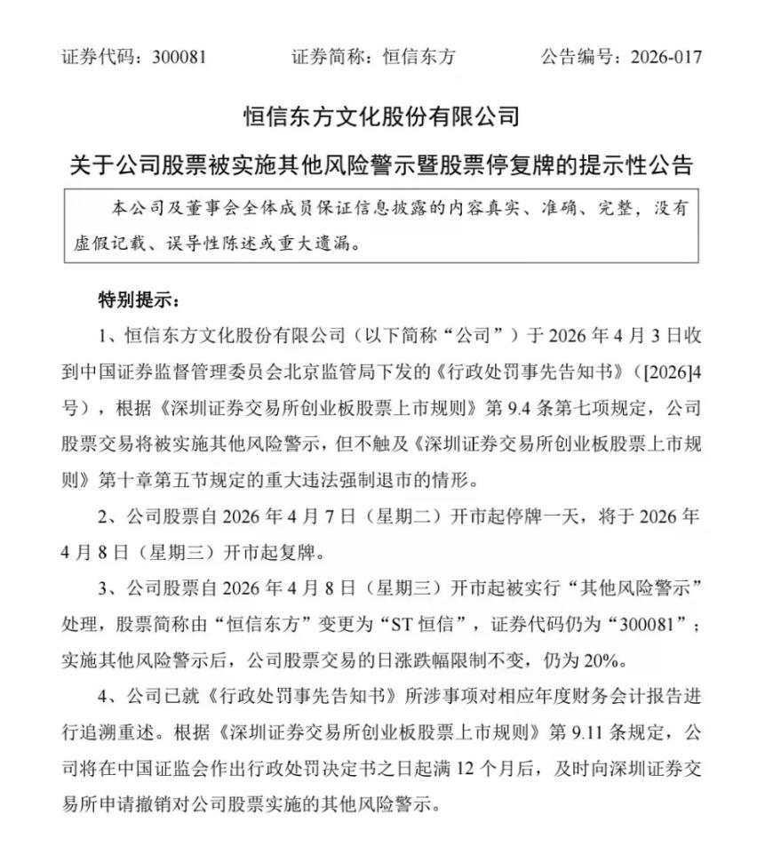 其股票自4月7日开市起停牌一天,4月8日开市起复牌并实施其他风险警示,股票简称由“恒信东方”变更为“ST恒信”,日涨跌幅限制仍为20%。恒信东方表示,公司已完成相关会计差错更正及整改,将在证监会作出行政处罚决定书之日起满12个月后,向深交所申请撤销其他风险警示。