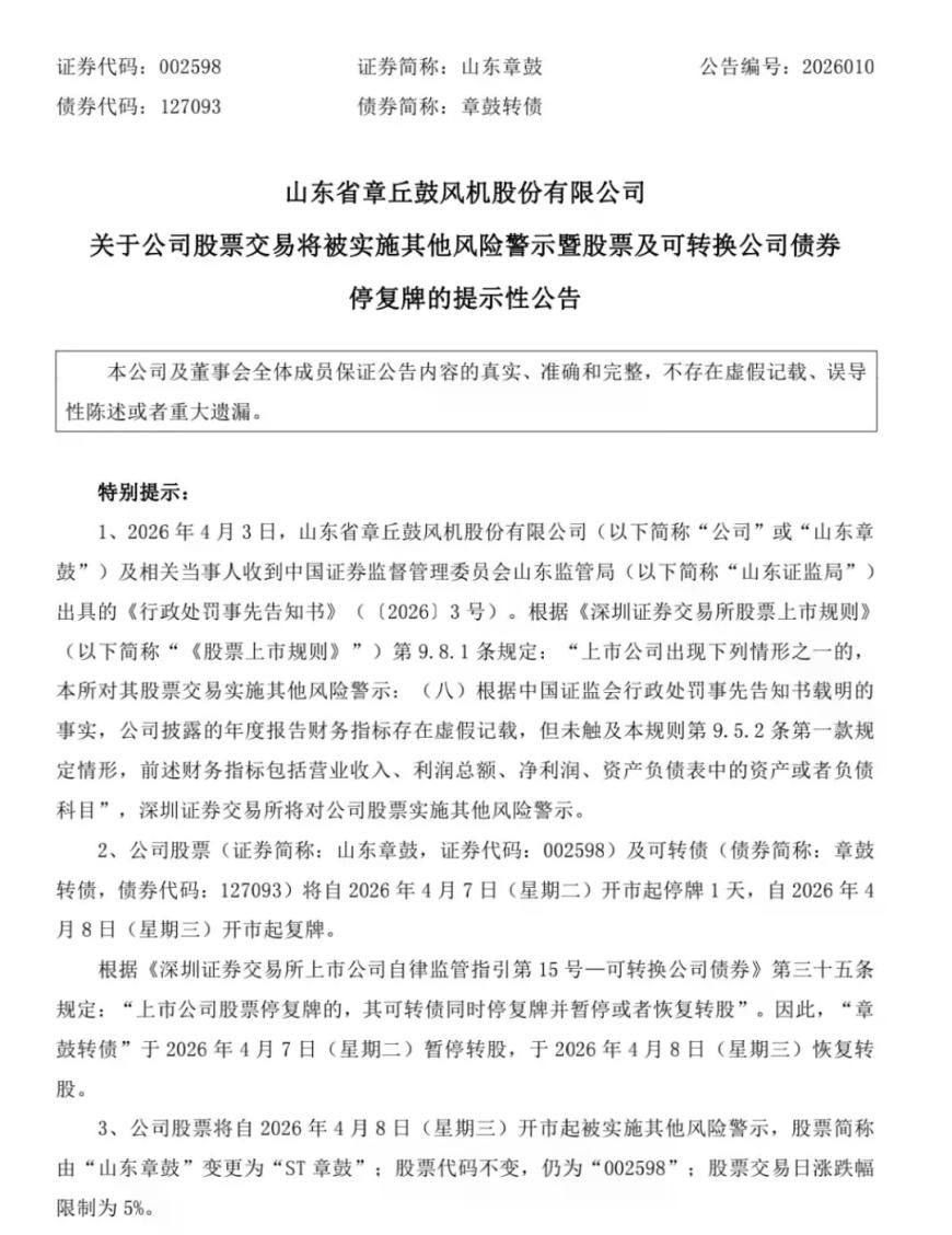 同样将于4月8日起被“ST”的还有山东章鼓(002598)。