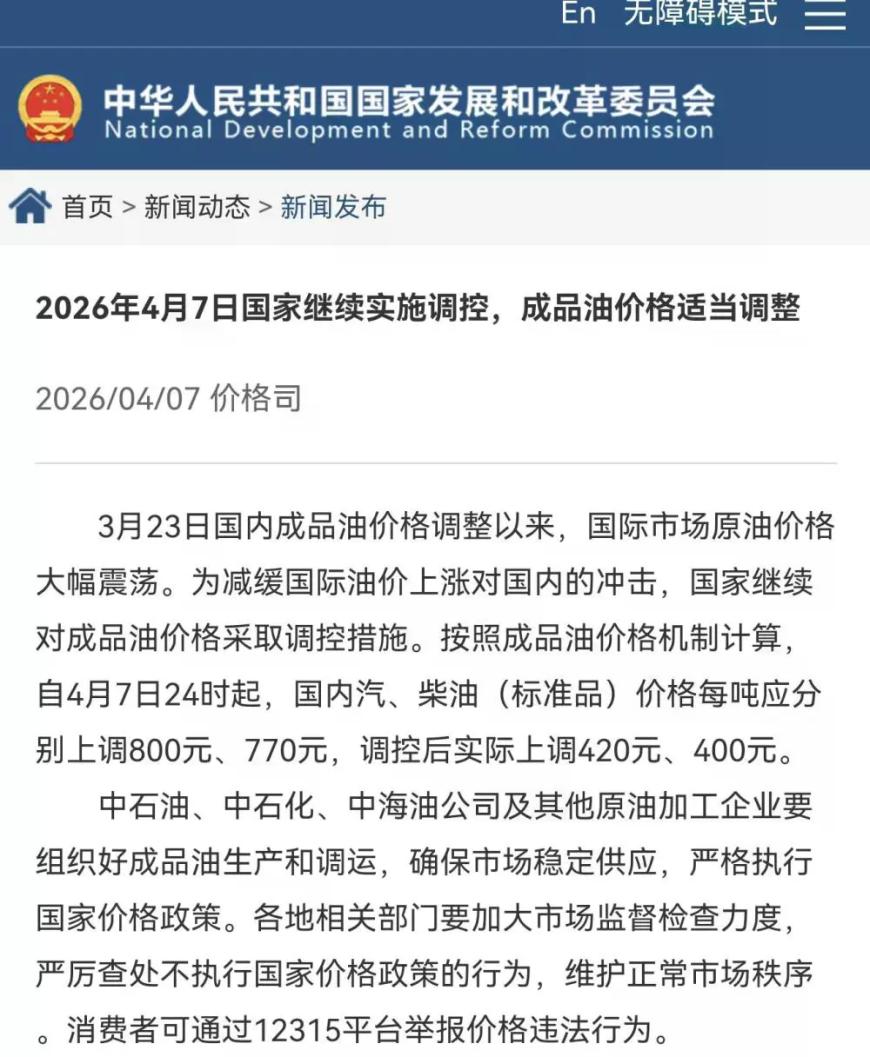 3月23日国内成品油价格调整以来,国际市场原油价格大幅震荡。为减缓国际油价上涨对国内的冲击,国家继续对成品油价格采取调控措施。按照成品油价格机制计算,自4月7日24时起,国内汽、柴油(标准品)价格每吨应分别上调800元、770元,调控后实际上调420元、400元。中石油、中石化、中海油公司及其他原油加工企业要组织好成品油生产和调运,确保市场稳定供应,严格执行国家价格政策。各地相关部门要加大市场监督检查力度,严厉查处不执行国家价格政策的行为,维护正常市场秩序。消费者可通过12315平台举报价格违法行为。