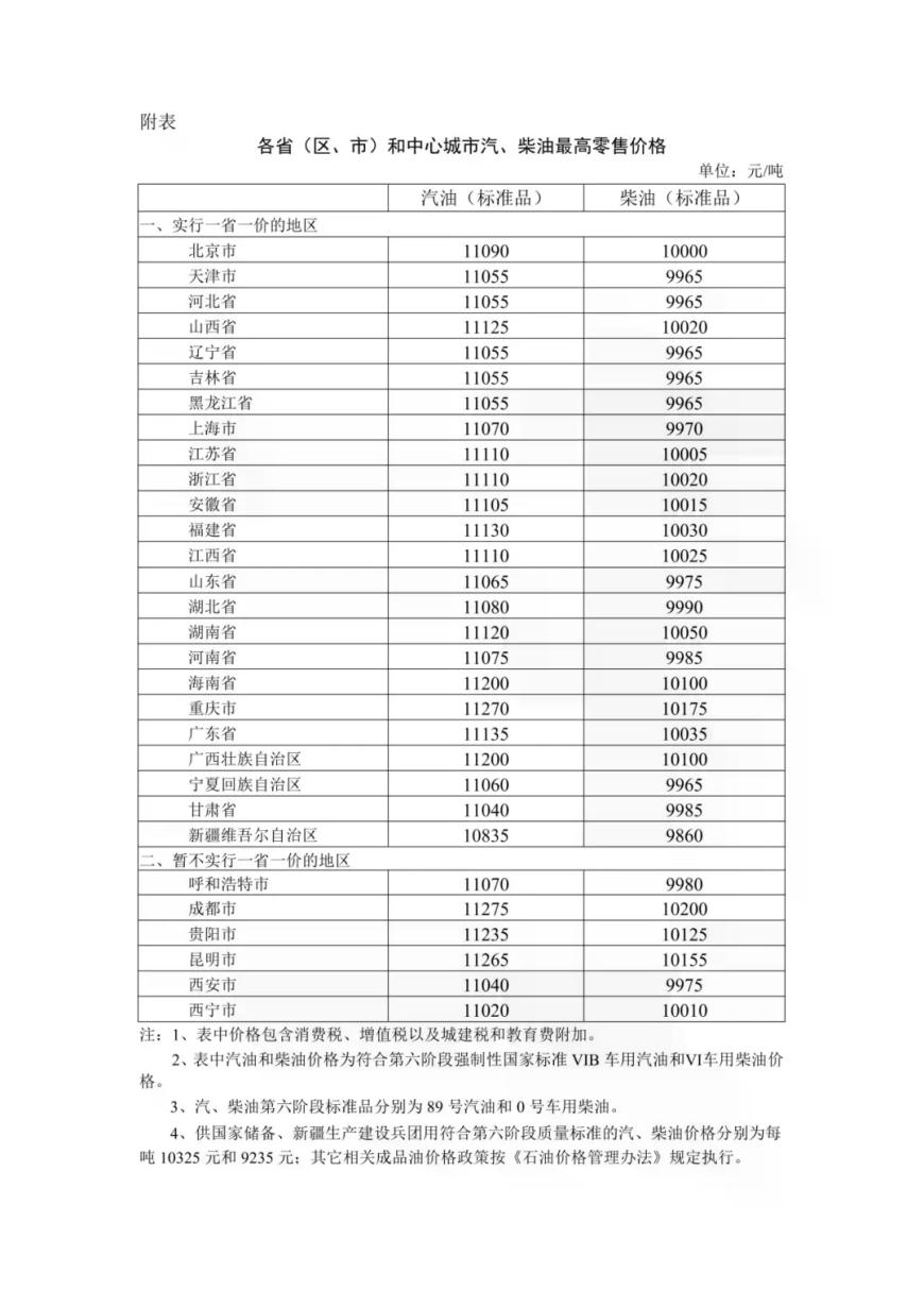 附:各省(区、市)和中心城市汽、柴油最高零售价格