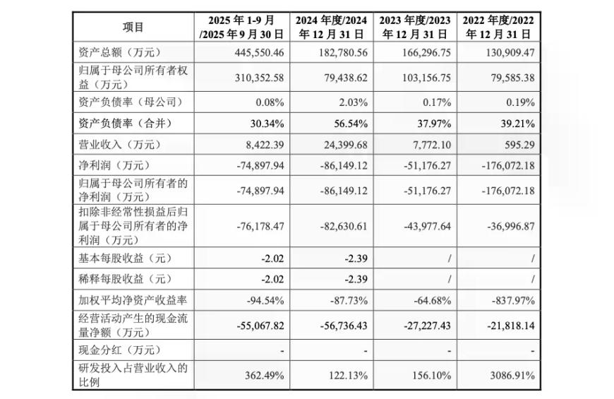2022-2024年及2025年前三季度(下称:报告期),中科宇航的营业收入分别约595.29万、7772.10万、2.44亿、8422.39万元,累计营收约4.12亿元,2022-2024年复合增长率达538.89%;净亏损分别约17.61亿、5.12亿、8.61亿、7.49亿元,累计亏损约38.83亿元;扣非归母净亏损分别约3.70亿、4.40亿、8.26亿、7.62亿元。