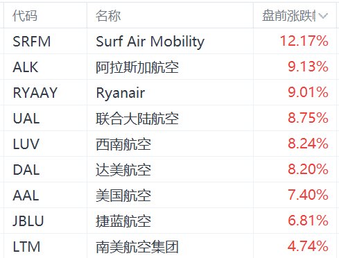 4月8日,美伊“停火两周”,国际油价大跌,刺激美股航空股盘前大涨,其中,Surf Air Mobility盘前大涨超12%,阿拉斯加航空、Ryanair涨超9%,联合大陆航空、西南航空、达美航空涨超8%,美国航空涨超7%,捷蓝航空涨超6%。