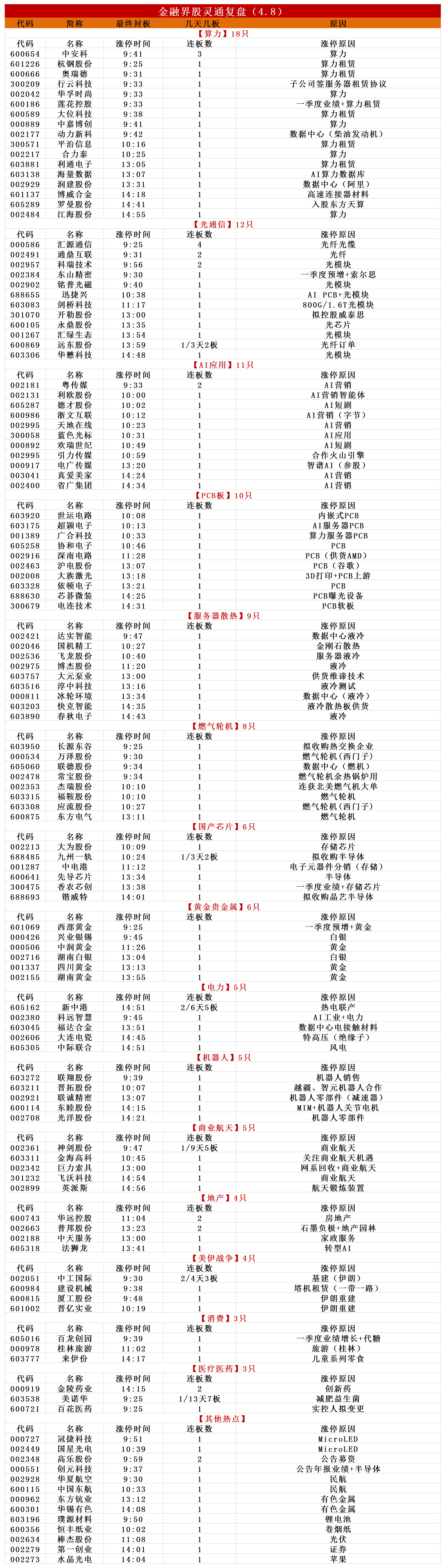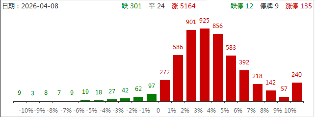 4月8日,市场集体反弹,沪指百点长阳,创业板指涨近6%,科创50指数涨超6%。截至收盘,沪指涨2.7%,深成指涨4.79%,创业板指涨5.91%。量能明显放大,沪深两市成交额2.43万亿,较上一个交易日放量8201亿。盘面上,受到美伊临时停战消息刺激,全市场超5100只个股上涨,其中135只个股涨停,连续两日超百股涨停。从板块来看,AI产业链集体爆发,其中算力租赁概念走强,大位科技、行云科技、奥瑞德、杭钢股份、华孚时尚涨停。算力硬件概念快速拉升,汇源通信连续一字晋级4连板,铭普光磁、东山精密、沪电股份、深南电路等多股涨停。AI应用端表现活跃,十余只成分股涨停,蓝色光标20CM涨停,志晟信息30CM涨停,利欧股份、引力传媒、省广集团等前期人气股涨停。贵金属概念集体走高,湖南黄金、四川黄金、西部黄金涨停。