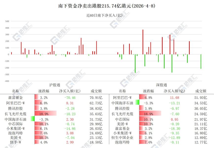 4月8日,南下资金今日净卖出港股215.74亿港元。其中:净买入阿里巴巴-W 19.99亿、快手-W 2.99亿、泡泡玛特2.96亿;净卖出盈富基金88.76亿、小米集团-W 24.21亿、长飞光纤光缆17.83亿、恒生中国企业12.89亿、中国海洋石油10.91亿、美团-W 7.24亿、腾讯控股3.24亿。据统计,南下资金已连续6日净卖出中海油,共计61.311亿港元;连续3日净卖出长飞光纤光缆,共计24.1218亿港元。