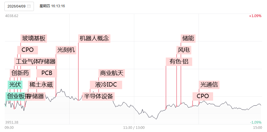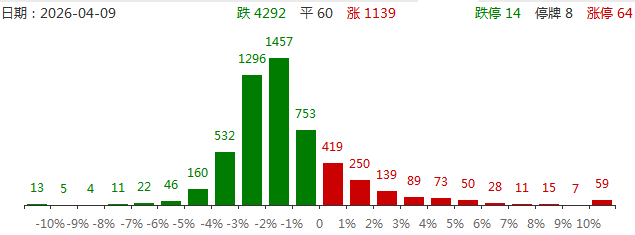 4月9日,市场全天震荡调整,沪指、创业板指均跌超0.5%。沪深两市成交额2.13万亿,较上一个交易日缩量3004亿。截至收盘,沪指跌0.72%,深成指跌0.33%,创业板指跌0.73%。盘面上,市场热度快速回落,全市场超4200只个股下跌。昨日连板股中仅汇源通信、华远控股两股晋级,其中汇源通信午后一度炸板,最终放量回封涨停走出5连板。从板块来看,市场选择继续相信“光”,光模块+光纤仍是绝对主线。长飞光纤尾盘涨停,总市值突破3000亿,特发信息、长江通信均涨停创历史新高;光模块方面,华懋科技、东山精密2连板,航天电器3天2板,叠加了华为概念的光迅科技涨停,中际旭创股价盘中触及700元/股,同样再创历史新高。液冷服务器概念震荡拉升,飞龙股份、博杰股份、大元泵业2连板。半导体设备概念表现活跃,柏诚股份6天3板,亚翔集成涨停。
