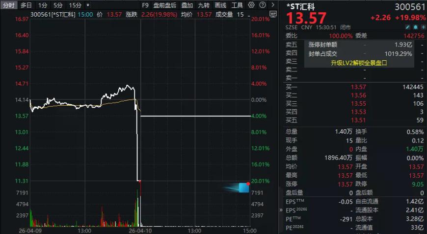 昨日尾盘突遭“20CM”跌停的*ST汇科(300561),今日早盘直接以“一字板”封住“20CM”涨停,最高封单金额超过6亿元。